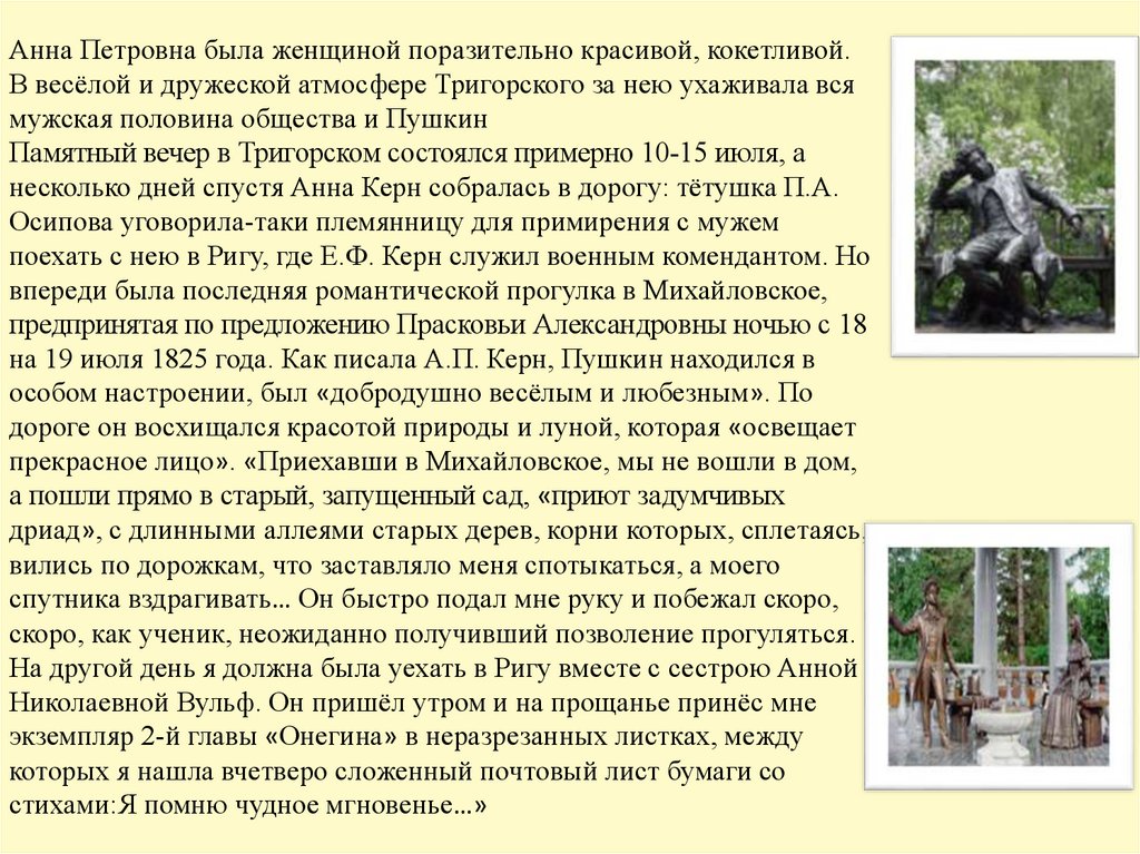 Анна Петровна была женщиной поразительно красивой, кокетливой.В весёлой и дружеской атмосфере Тригорского за нею ухаживала вся