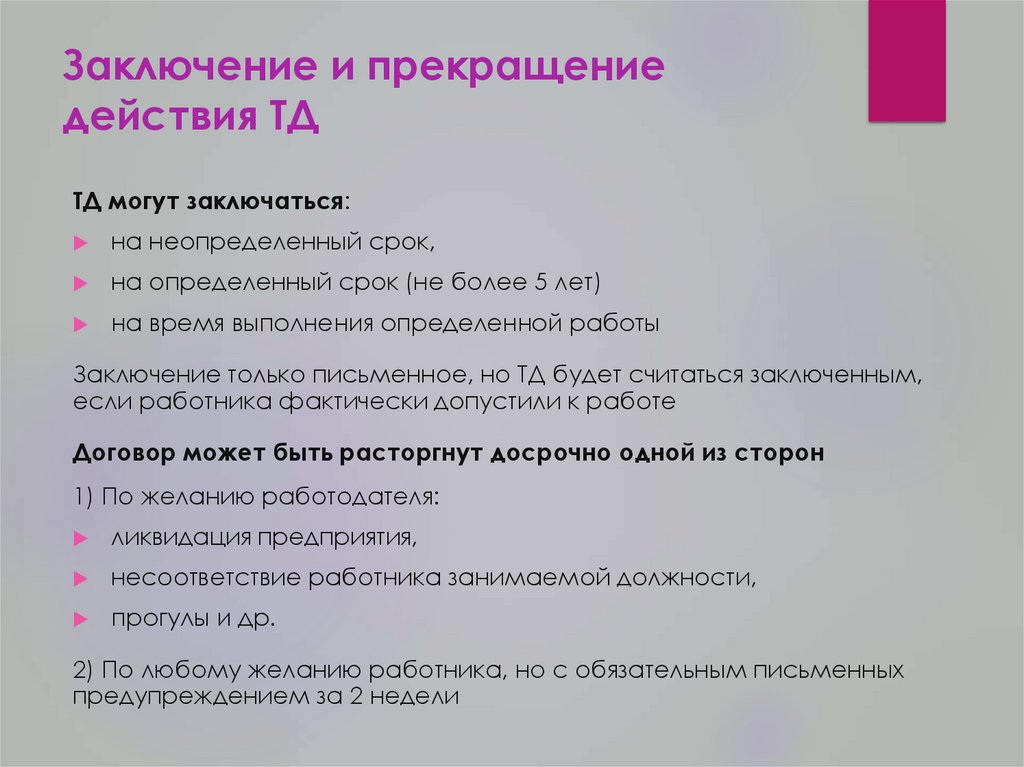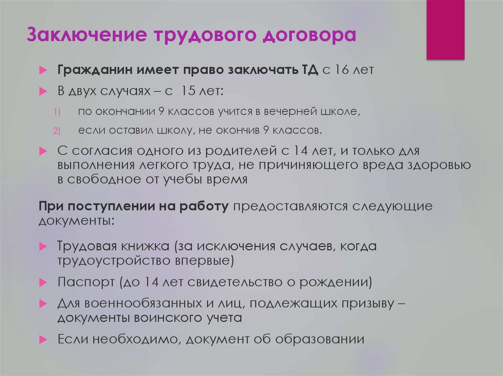 Заключение трудового договораГражданин имеет право заключать ТД с 16 лет