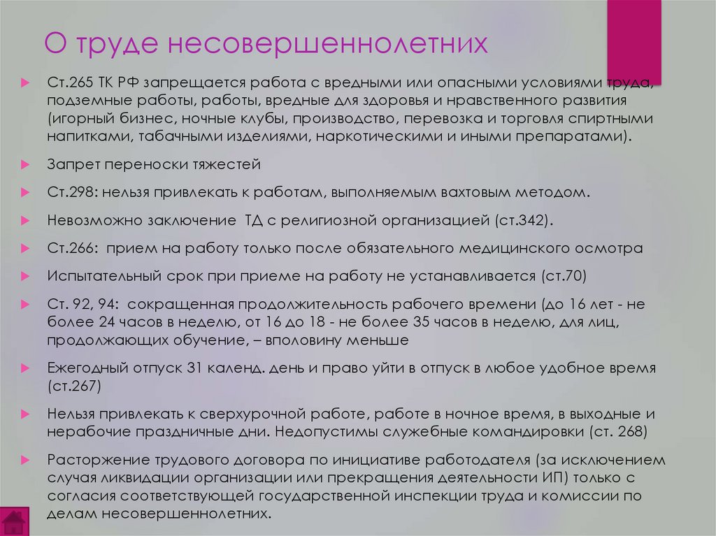 О труде несовершеннолетнихСт.265 ТК РФ запрещается работа с вредными или опасными условиями труда,