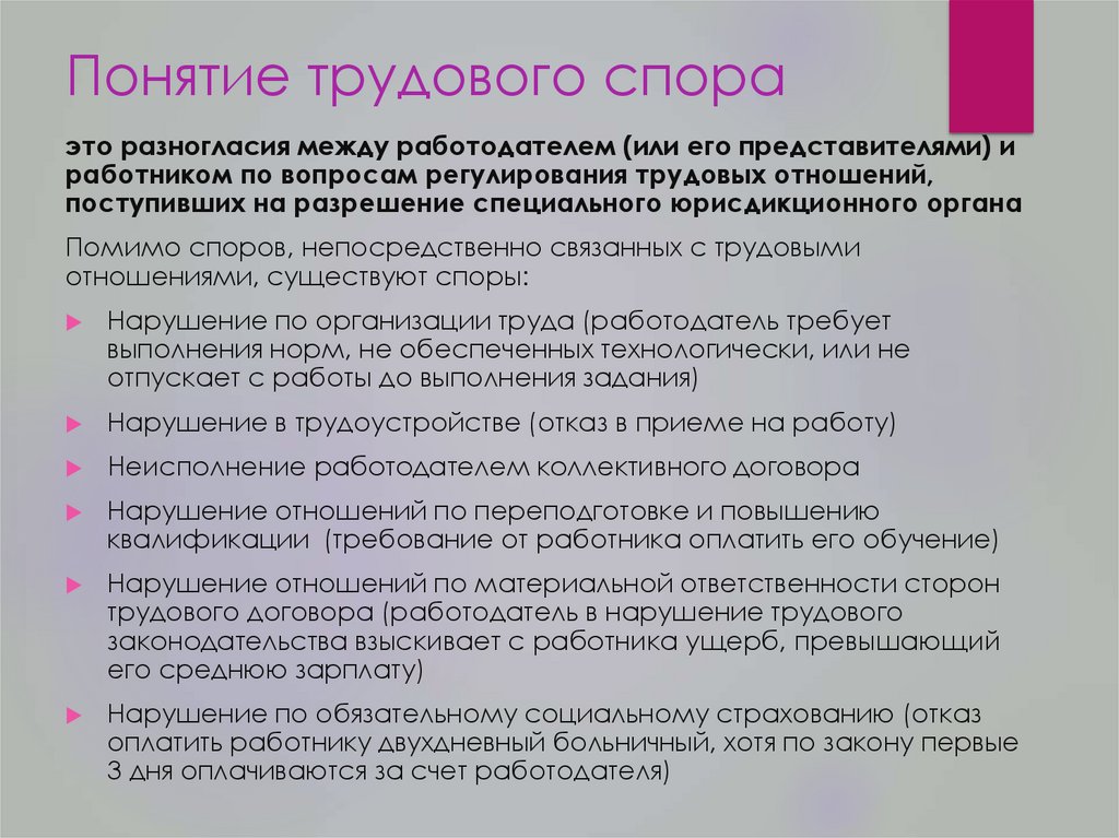 Понятие трудового спораэто разногласия между работодателем (или его представителями) и