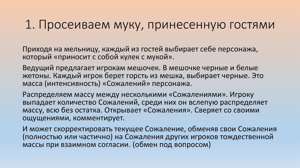 1. Просеиваем муку, принесенную гостямиПриходя на мельницу, каждый из гостей выбирает себе персонажа,