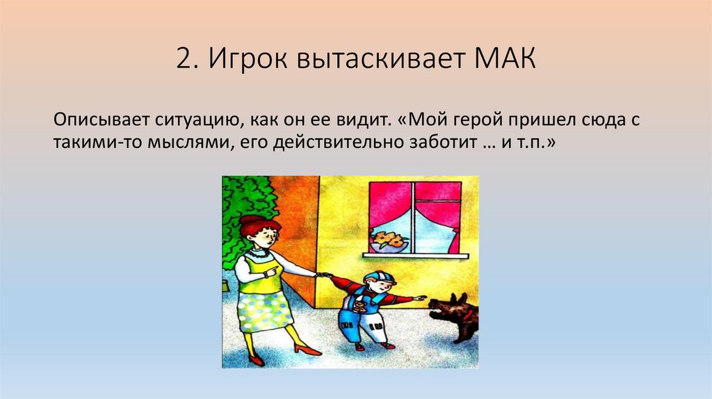 2. Игрок вытаскивает МАКОписывает ситуацию, как он ее видит. «Мой герой пришел сюда с
