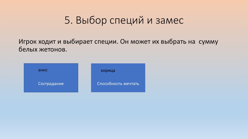 5. Выбор специй и замесИгрок ходит и выбирает специи. Он может их выбрать на сумму