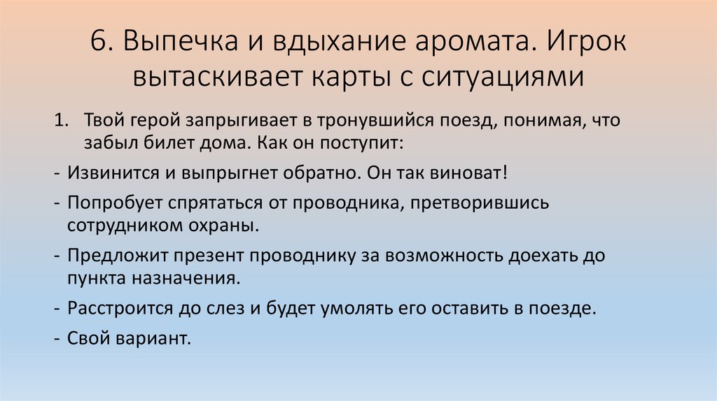 6. Выпечка и вдыхание аромата. Игроквытаскивает карты с ситуациями