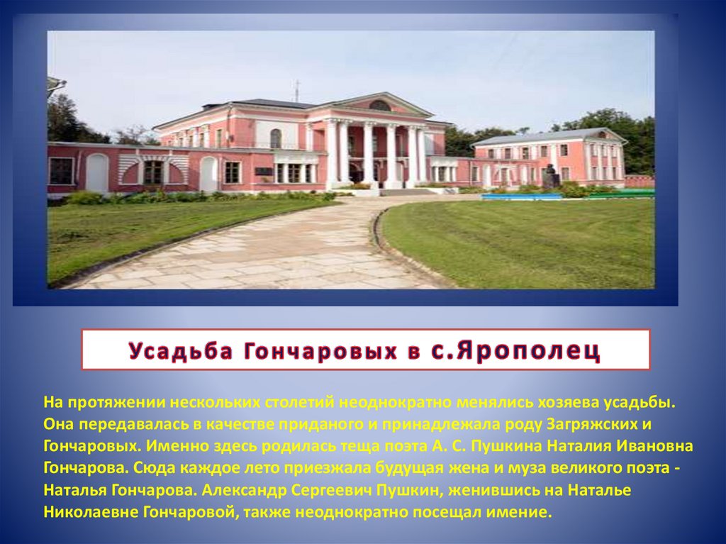 Гончаровых. Именно здесь родилась теща поэта А. С. Пушкина Наталия Ивановна