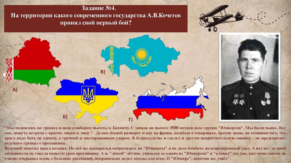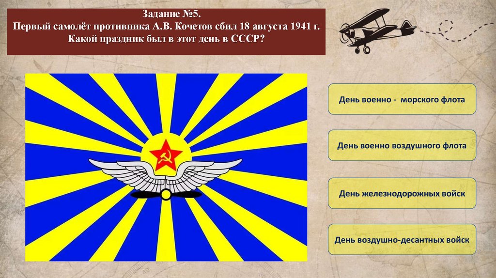 Задание №5.Первый самолёт противника А.В. Кочетов сбил 18 августа 1941 г.