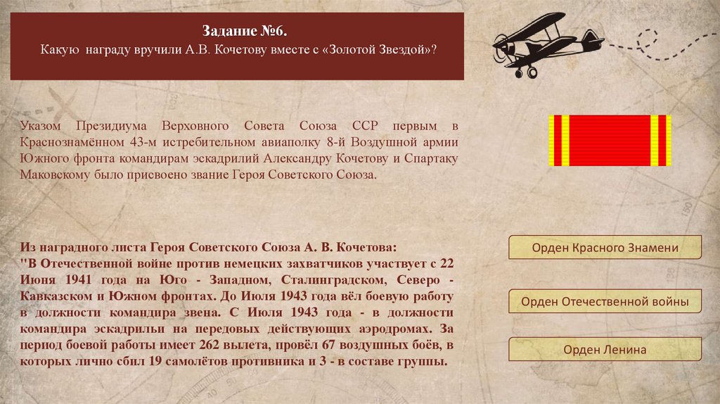 Задание №6.Какую награду вручили А.В. Кочетову вместе с «Золотой Звездой»?