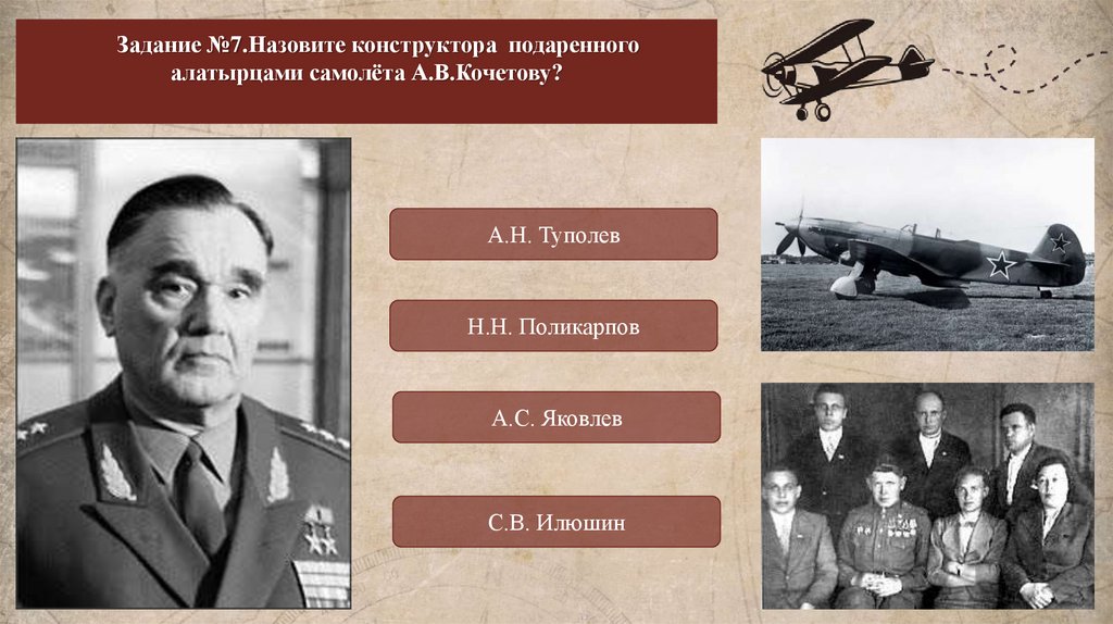 Задание №7.Назовите конструктора подаренногоалатырцами самолёта А.В.Кочетову?