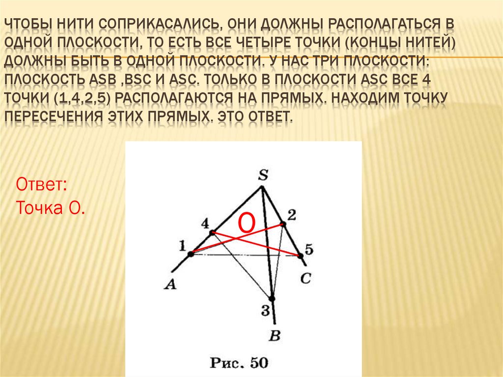 ЧТОБЫ НИТИ СОПРИКАСАЛИСЬ, ОНИ ДОЛЖНЫ РАСПОЛАГАТЬСЯ ВОДНОЙ ПЛОСКОСТИ, ТО ЕСТЬ ВСЕ ЧЕТЫРЕ ТОЧКИ (КОНЦЫ НИТЕЙ)