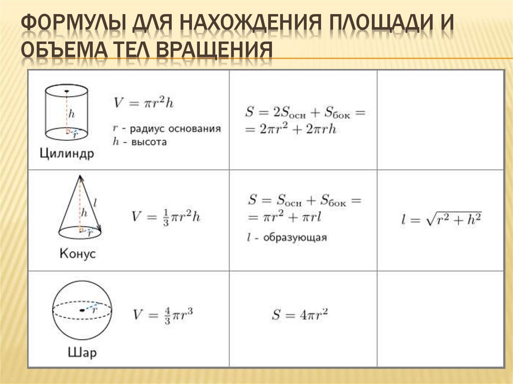 ФОРМУЛЫ ДЛЯ НАХОЖДЕНИЯ ПЛОЩАДИ ИОБЪЕМА ТЕЛ ВРАЩЕНИЯ