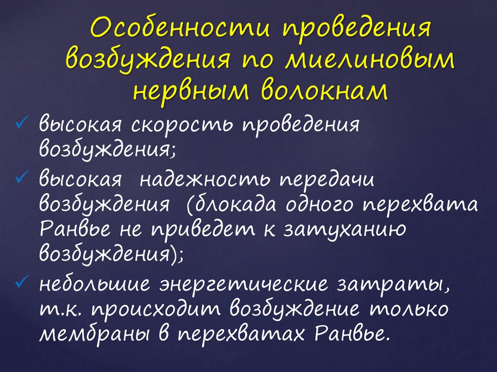 Особенности проведениявозбуждения по миелиновым