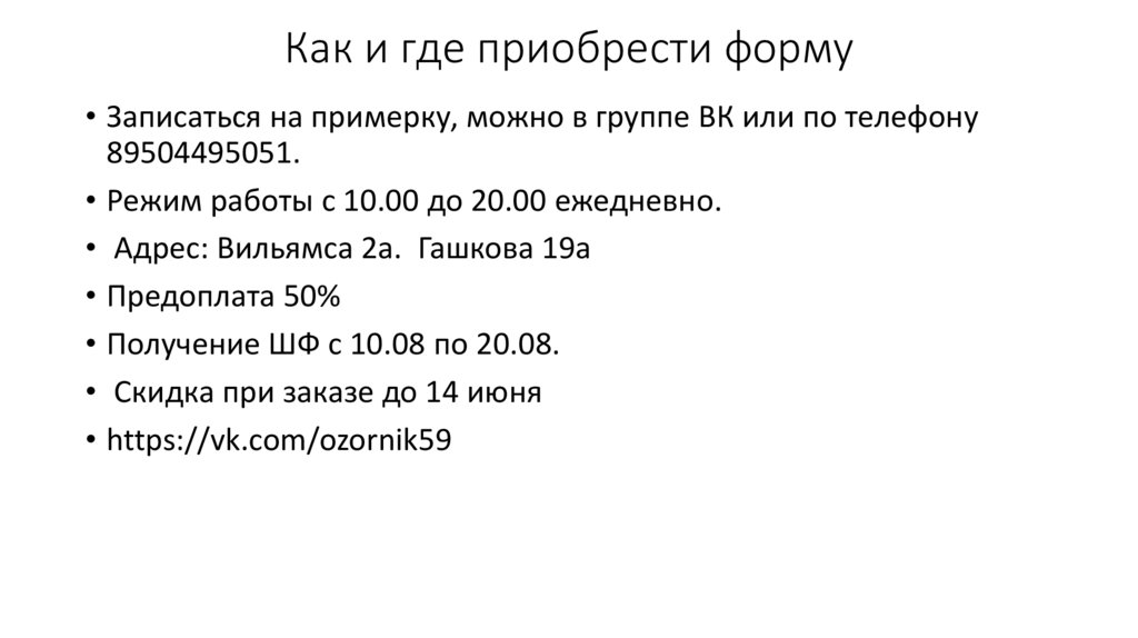 Как и где приобрести форму• Записаться на примерку, можно в группе ВК или по телефону