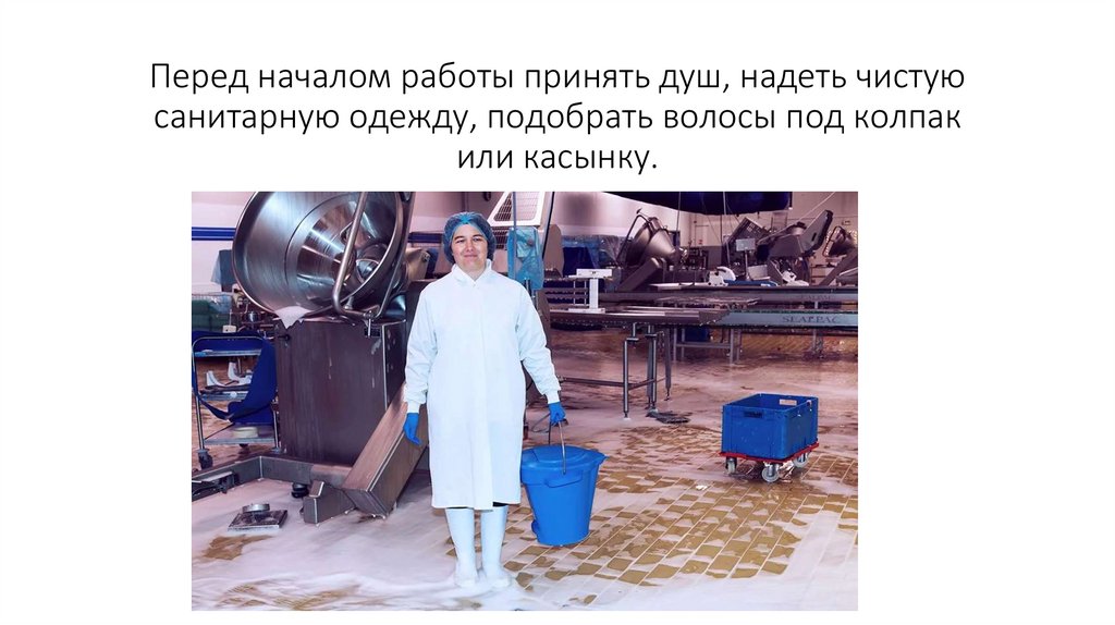 Перед началом работы принять душ, надеть чистуюсанитарную одежду, подобрать волосы под колпак