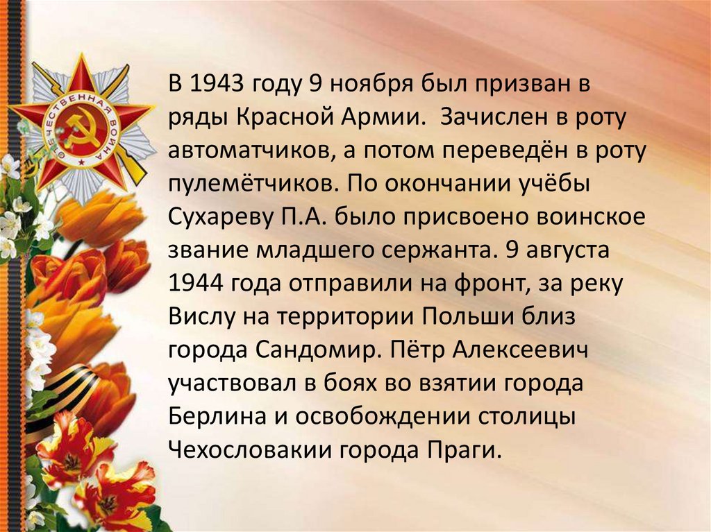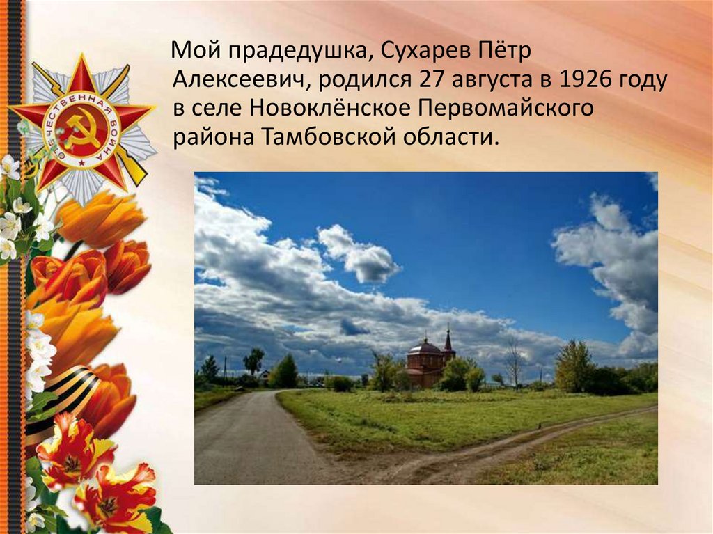 Мой прадедушка, Сухарев ПётрАлексеевич, родился 27 августа в 1926 году