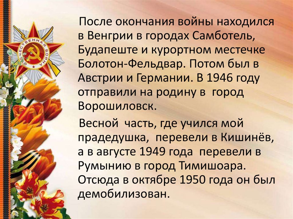После окончания войны находилсяв Венгрии в городах Самботель,