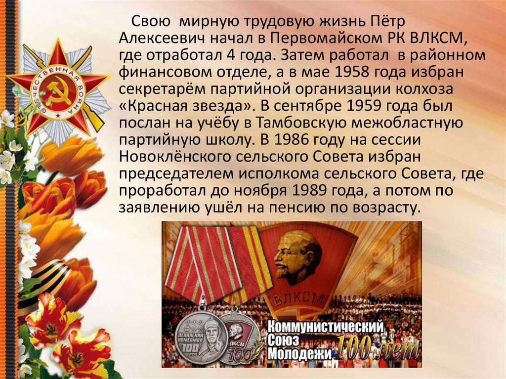 Свою мирную трудовую жизнь ПётрАлексеевич начал в Первомайском РК ВЛКСМ,
