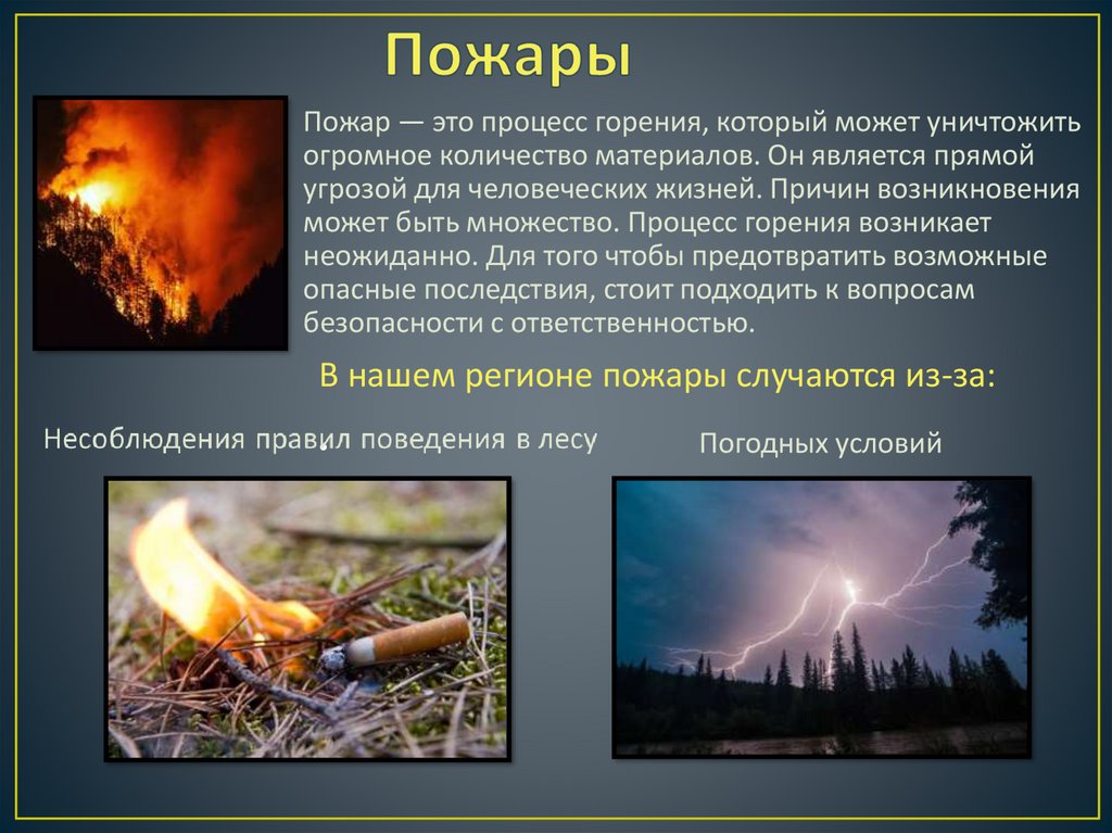 • Пожар — это процесс горения, который может уничтожитьогромное количество материалов. Он является прямой