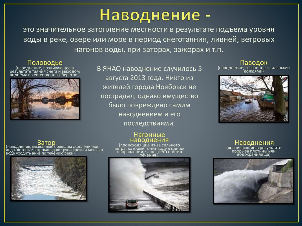 это значительное затопление местности в результате подъема уровняводы в реке, озере или море в период снеготаяния, ливней, ветровых