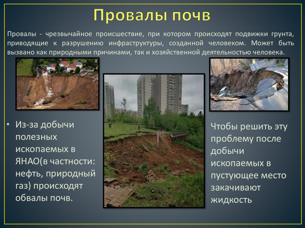 Провалы - чрезвычайное происшествие, при котором происходят подвижки грунта,приводящие к разрушению инфраструктуры, созданной человеком. Может быть