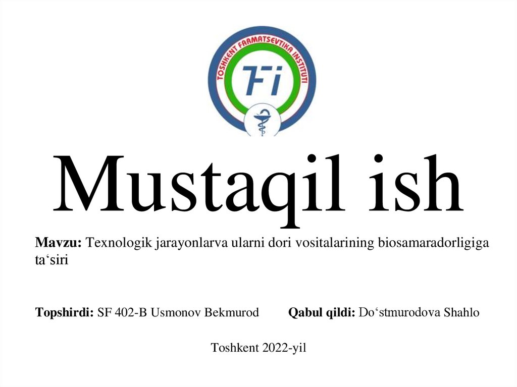Mustaqil ishMavzu: Texnologik jarayonlarva ularni dori vositalarining biosamaradorligiga