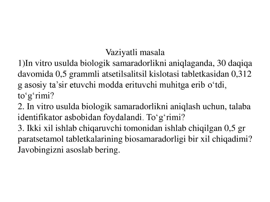 Vaziyatli masala1)In vitro usulda biologik samaradorlikni aniqlaganda, 30 daqiqa