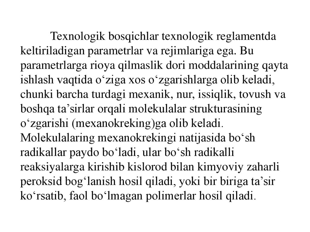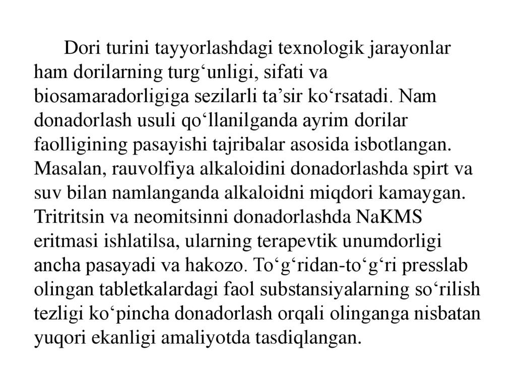 Texnologik jarayonlarva ularni dori vositalarining biosamaradorligiga ta‘siri