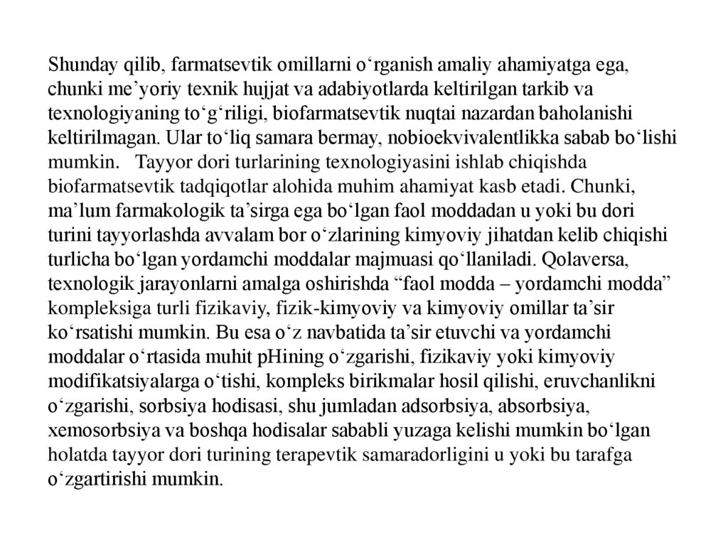 Shunday qilib, farmatsevtik omillarni o‘rganish amaliy ahamiyatga ega,chunki me’yoriy texnik hujjat va adabiyotlarda keltirilgan tarkib va