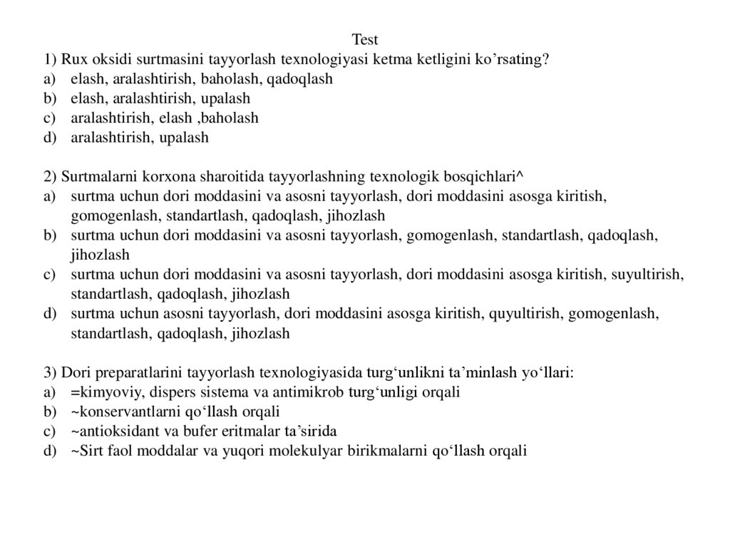 Test1) Rux oksidi surtmasini tayyorlash texnologiyasi ketma ketligini ko’rsating?