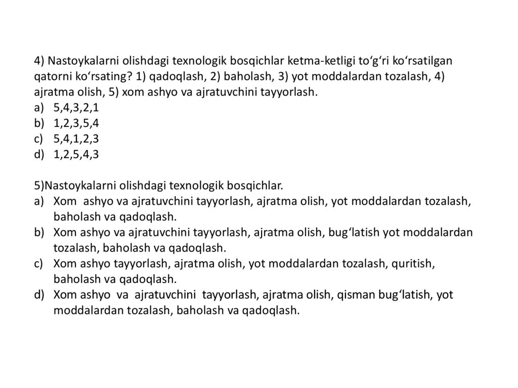 4) Nastoykalarni olishdagi texnologik bosqichlar ketma-ketligi to‘g‘ri ko‘rsatilganqatorni ko‘rsating? 1) qadoqlash, 2) baholash, 3) yot moddalardan tozalash, 4)