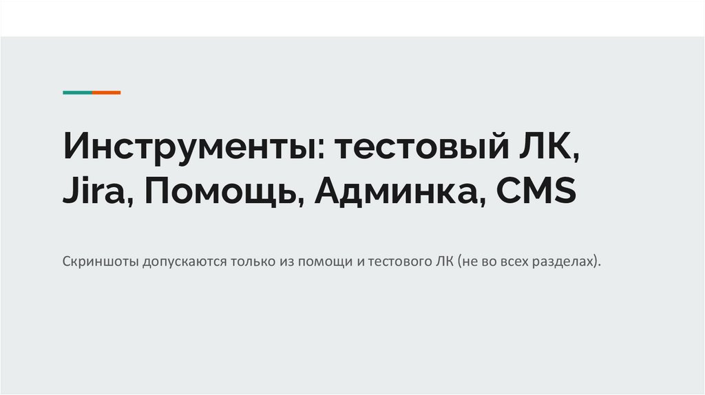 Инструменты: тестовый ЛК,Jira, Помощь, Админка, CMS