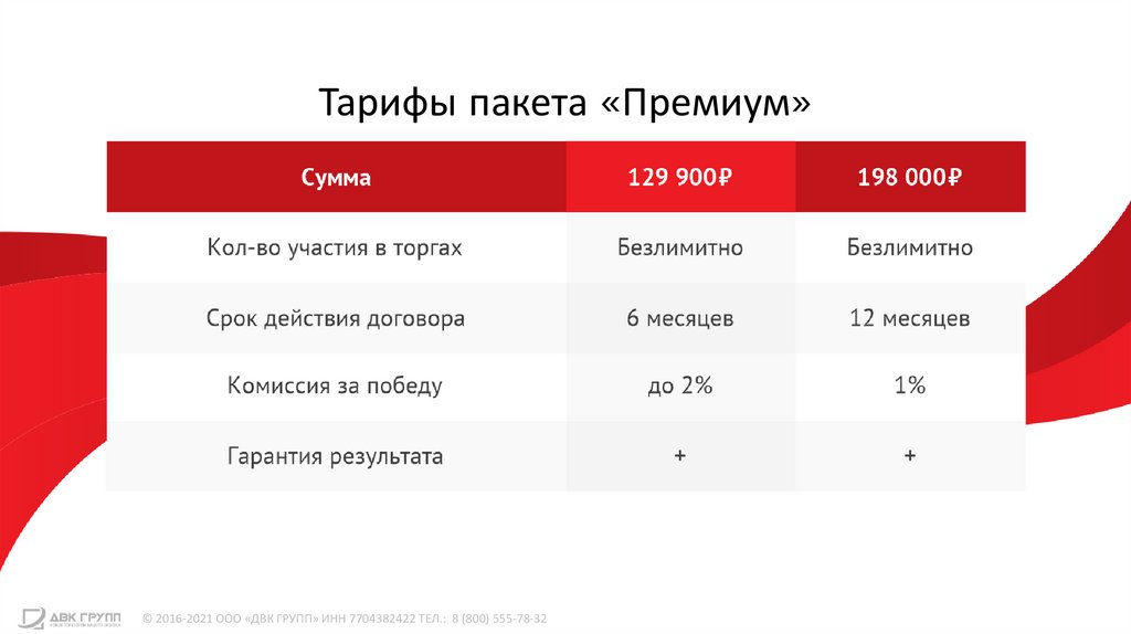 Тарифы пакета «Премиум»© 2016-2021 ООО «ДВК ГРУПП» ИНН 7704382422 ТЕЛ.: 8 (800) 555-78-32