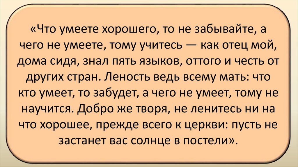 «Что умеете хорошего, то не забывайте, ачего не умеете, тому учитесь — как отец мой,