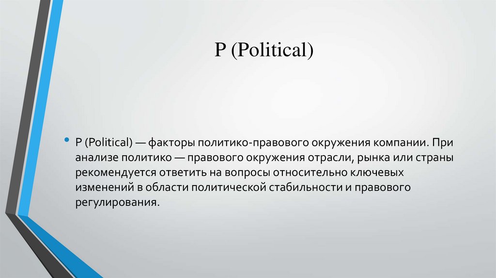 P (Political)• P (Political) — факторы политико-правового окружения компании. При