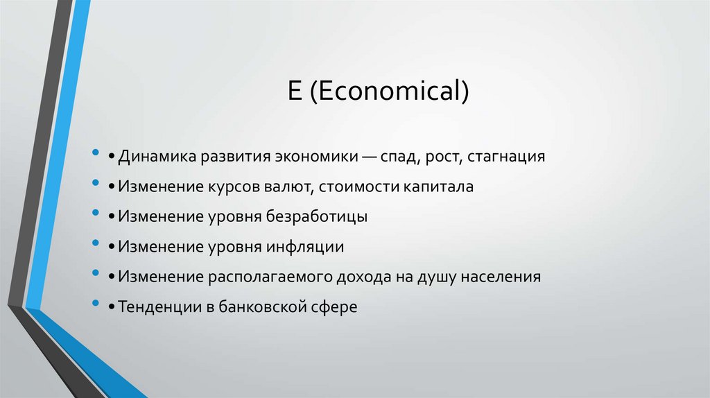 E (Economical)• • Динамика развития экономики — спад, рост, стагнация