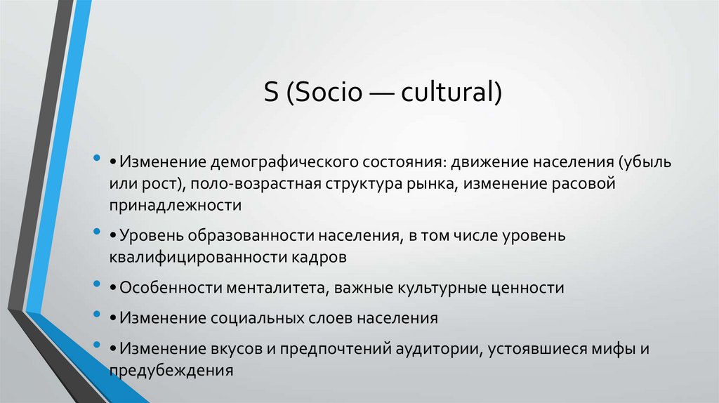 S (Socio — cultural)• • Изменение демографического состояния: движение населения (убыль