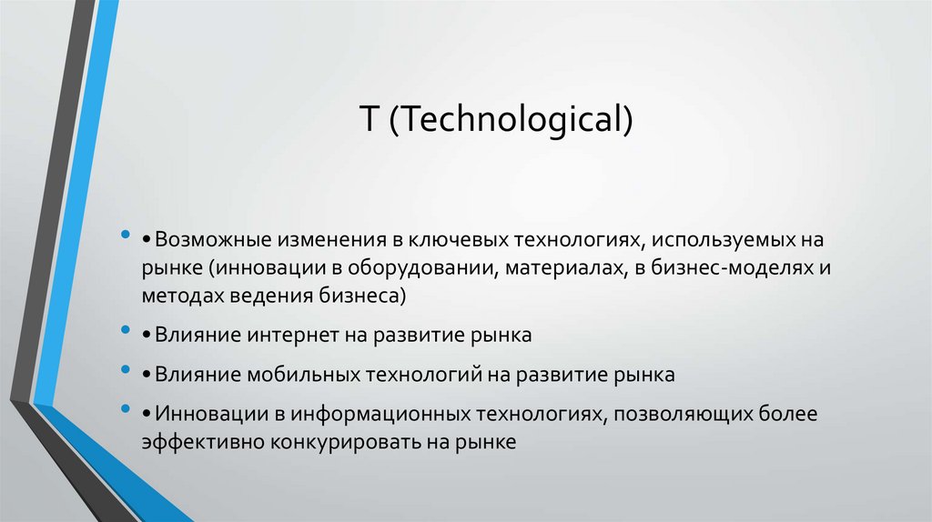 T (Technological)• • Возможные изменения в ключевых технологиях, используемых на