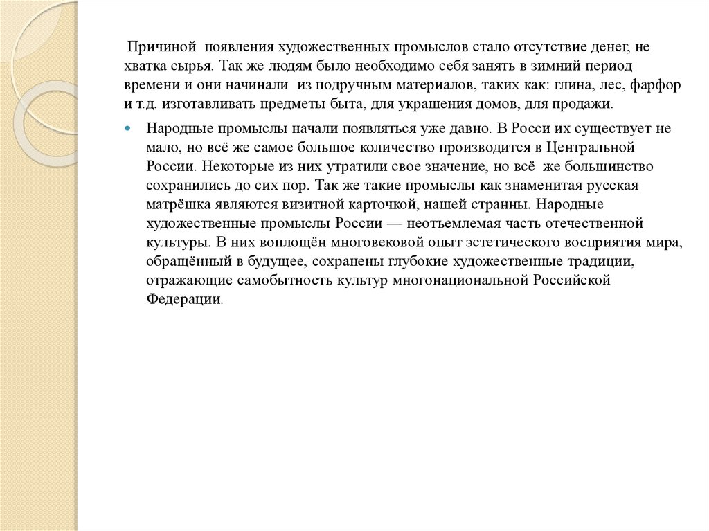 Причиной появления художественных промыслов стало отсутствие денег, нехватка сырья. Так же людям было необходимо себя занять в зимний период
