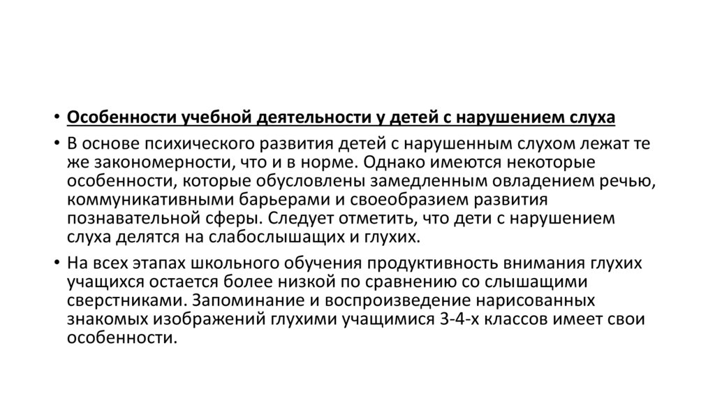 • Особенности учебной деятельности у детей с нарушением слуха• В основе психического развития детей с нарушенным слухом лежат те