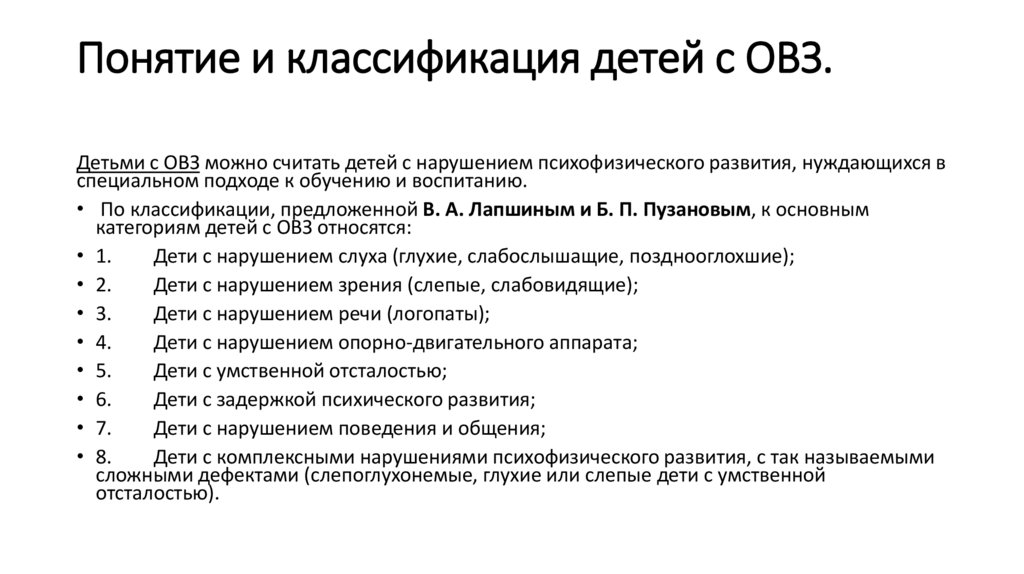 Понятие и классификация детей с ОВЗ.Детьми с ОВЗ можно считать детей с нарушением психофизического развития, нуждающихся в