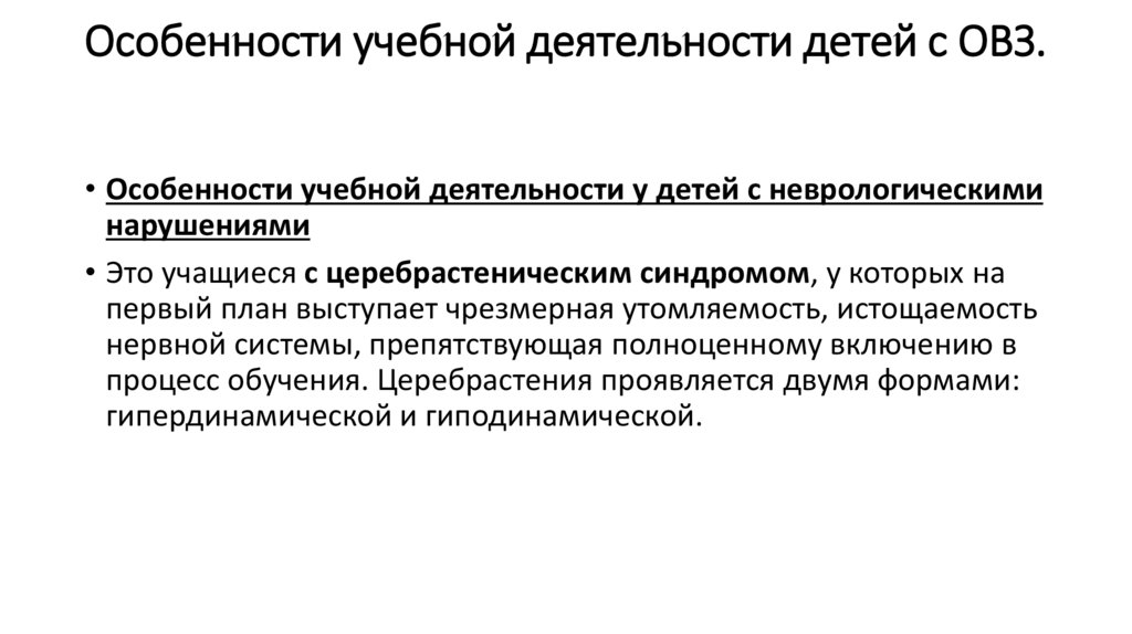 Особенности учебной деятельности детей с ОВЗ.• Особенности учебной деятельности у детей с неврологическими