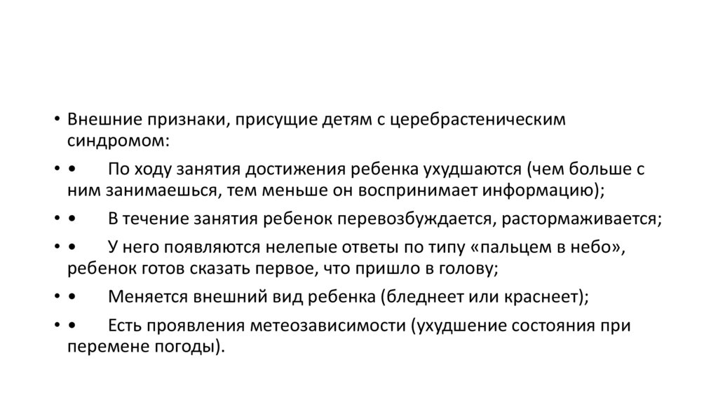 • Внешние признаки, присущие детям с церебрастеническимсиндромом: