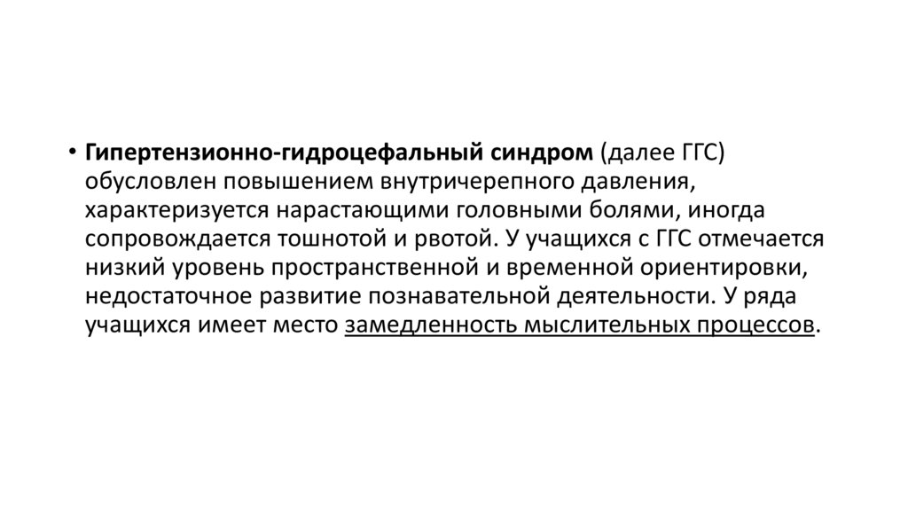 • Гипертензионно-гидроцефальный синдром (далее ГГС)обусловлен повышением внутричерепного давления,
