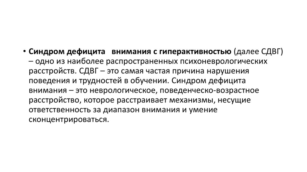• Синдром дефицита внимания с гиперактивностью (далее СДВГ)– одно из наиболее распространенных психоневрологических