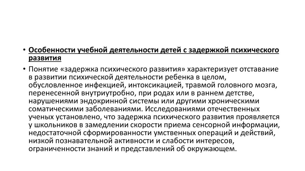 • Понятие «задержка психического развития» характеризует отставание