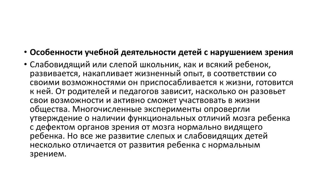 • Особенности учебной деятельности детей с нарушением зрения• Слабовидящий или слепой школьник, как и всякий ребенок,