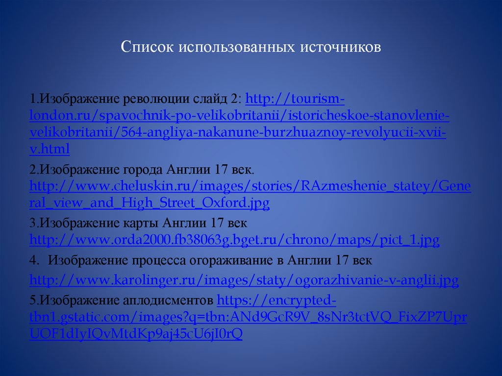 Список использованных источников1.Изображение революции слайд 2: http://tourismlondon.ru/spavochnik-po-velikobritanii/istoricheskoe-stanovlenievelikobritanii/564-angliya-nakanune-burzhuaznoy-revolyucii-xviiv.html