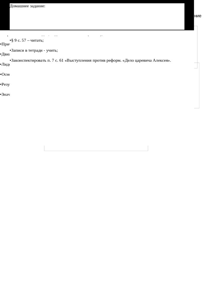 •Законспектировать п. 7 с. 61 «Выступления против реформ. «Дело царевича Алексея».