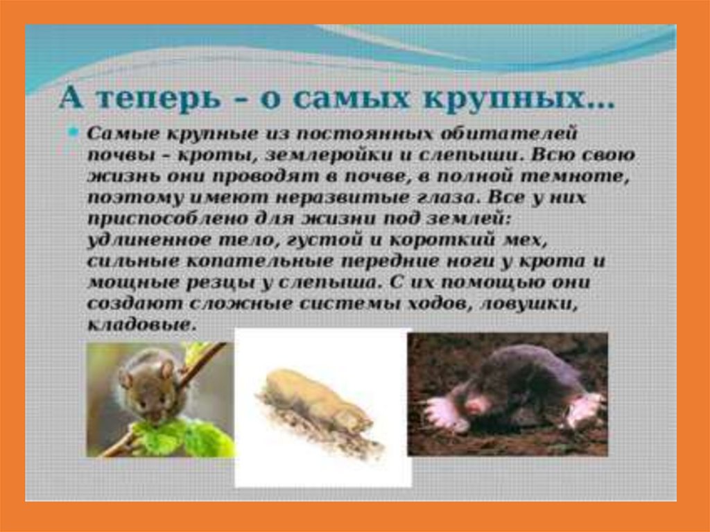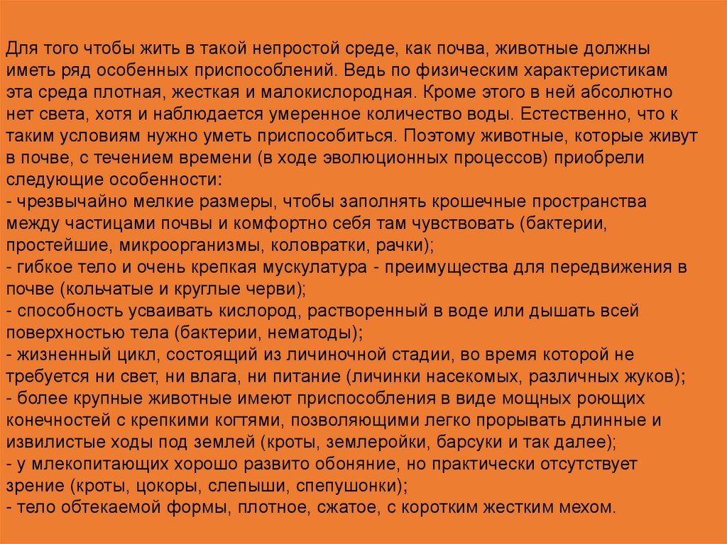 Для того чтобы жить в такой непростой среде, как почва, животные должныиметь ряд особенных приспособлений. Ведь по физическим характеристикам