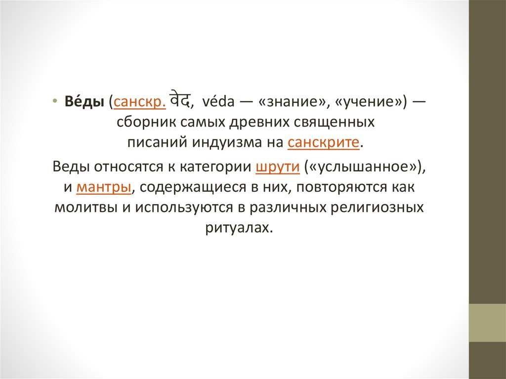 • Ве́ды (санскр. वेद, véda — «знание», «учение») —сборник самых древних священных