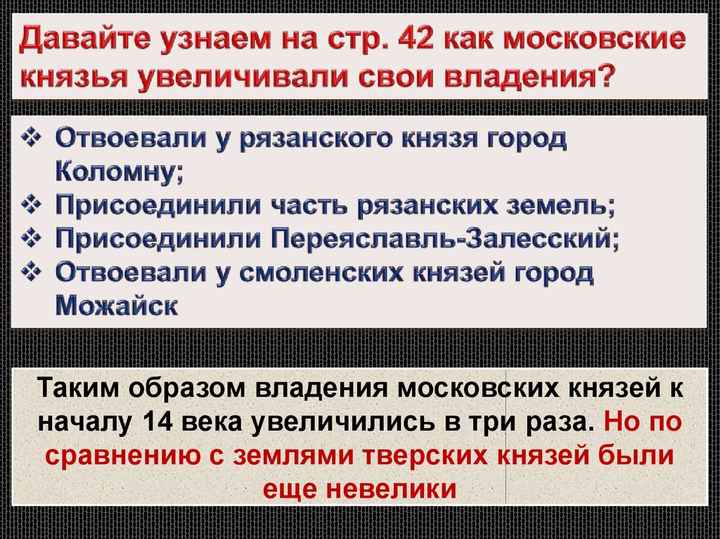 Таким образом владения московских князей кначалу 14 века увеличились в три раза. Но по